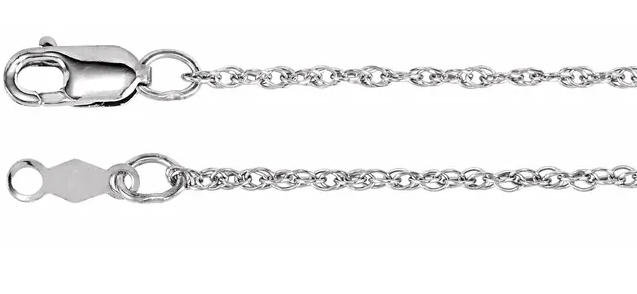 Rhodium-Plated Sterling Silver 1.25 mm Rope 18" ChainSpecificationsWeight: 0.73 DWT (1.14 grams)Clasp Type: Lobster ClaspMaterial: Sterling SilverSolid/Hollow: SolidApprox. Length: 18 InApprox. Width: 1.2 mm quantity